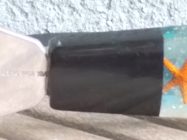 Décapsuleur, manche en résine inclusion de « Coquillages » et Inox 18/8. De Acero