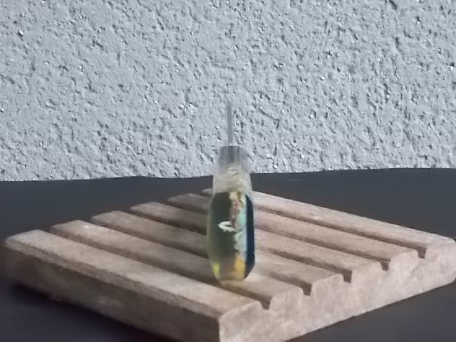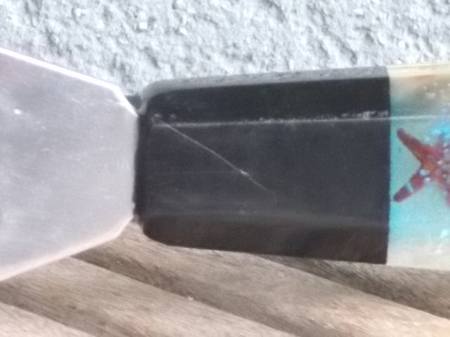 Décapsuleur, manche en Résine avec inclusion de Coquillages, Etoile de Mer, Crabe, plante Aquatique. Forme conique, dessus bombé, arrière plat teinté en Bleu, pans coupé, rehaussé de paillettes, partie haute teinté Noir. Décapsuleur en Inox 18/8. Edité dans les années 70. De la Marque Acero.