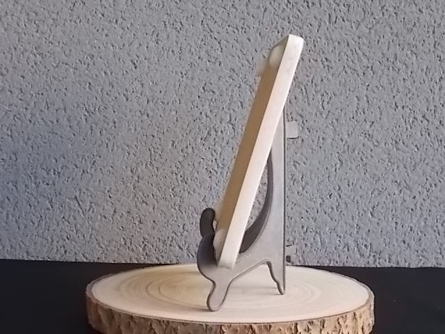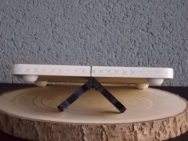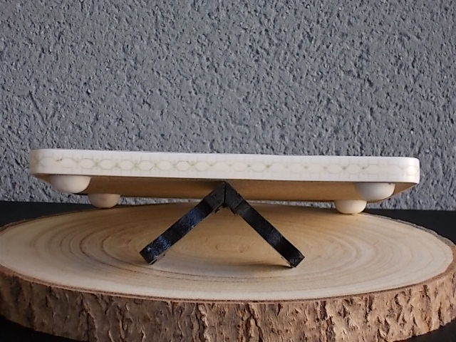 Dessous de plat carré, à angles arrondis. Dessus en Formica Blanc, décors de Scènes Hollandaises Bleues. Motif de carrelage en losange, à joint Gris. Sur aggloméré brut, chant en plastique Blanc, à motif de frise géométrique. Sur pied en demi sphère, en plastique Blanc vissé. Edité dans les années 70.