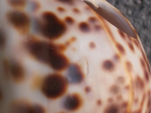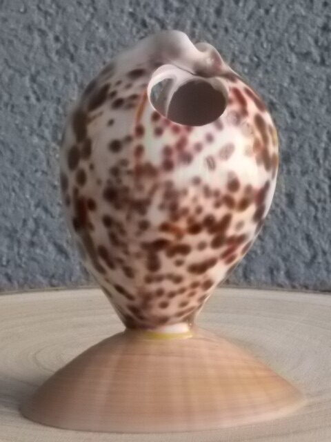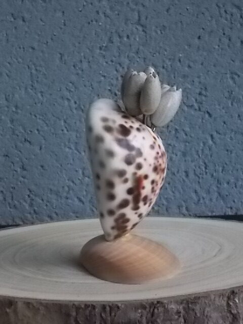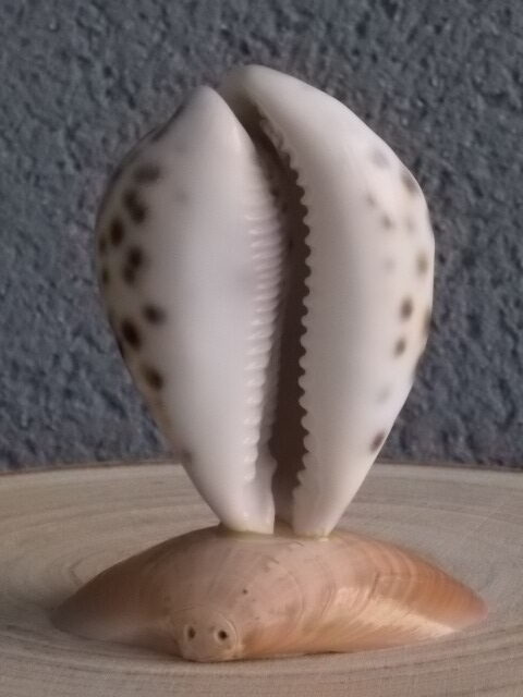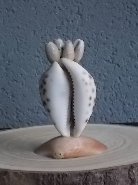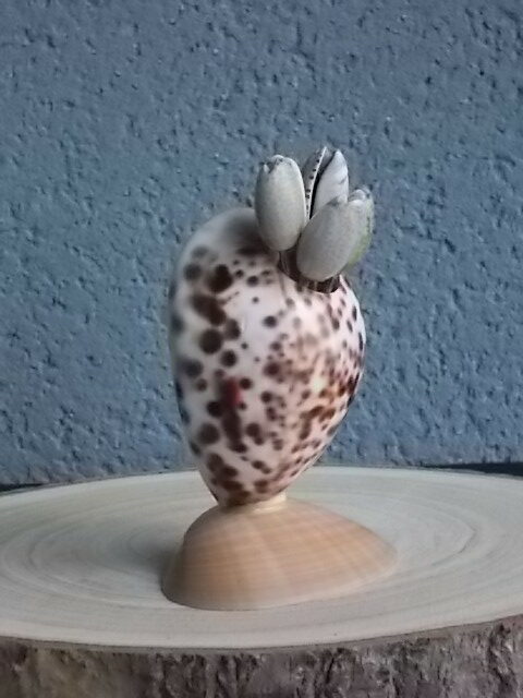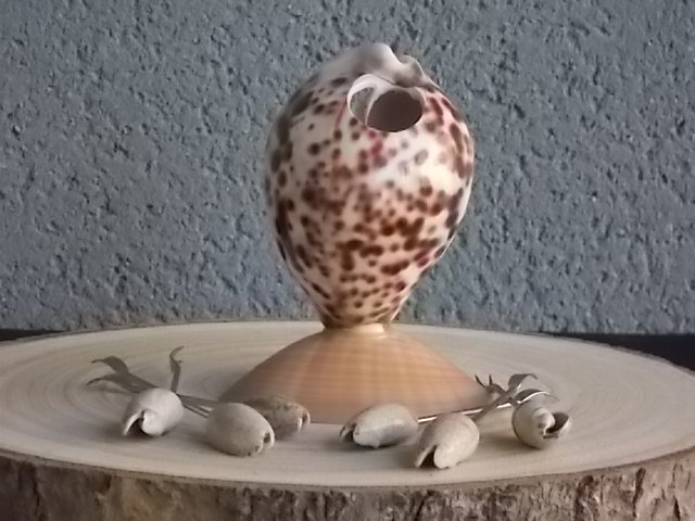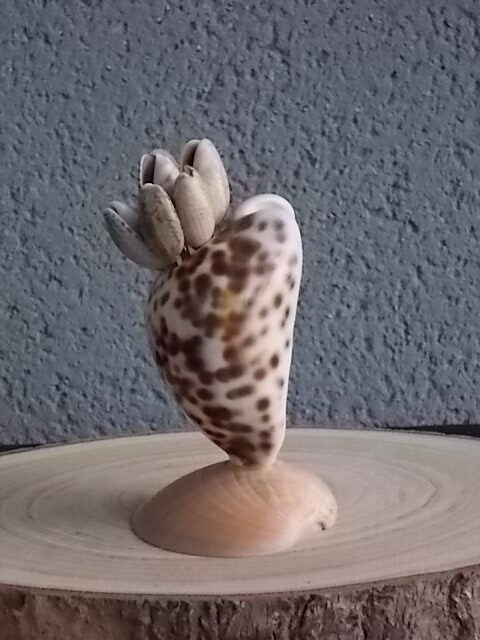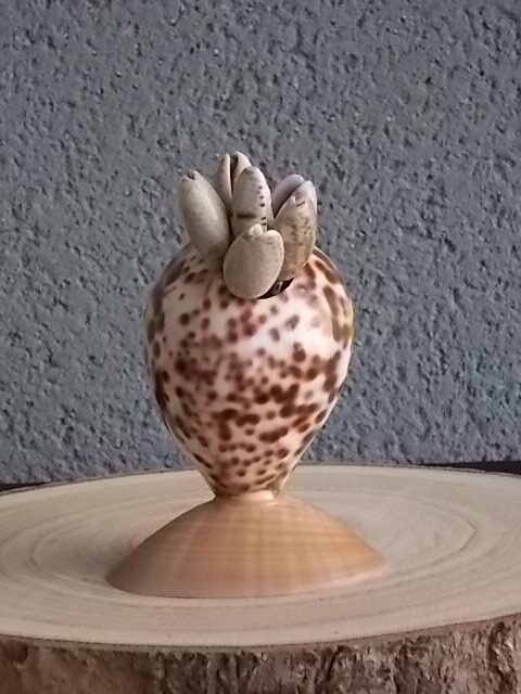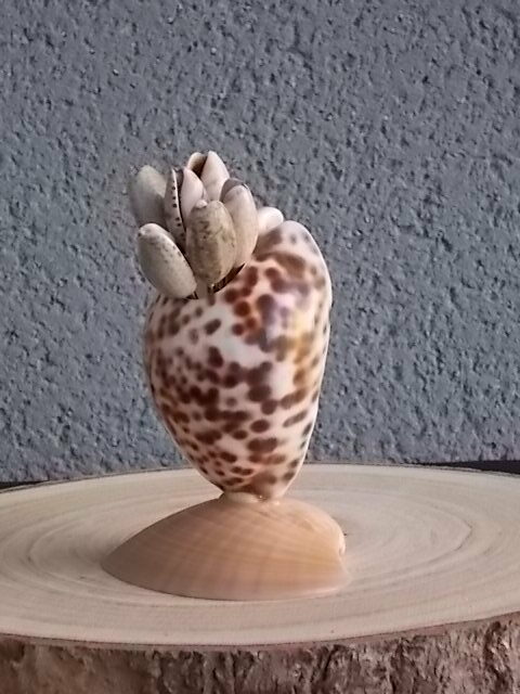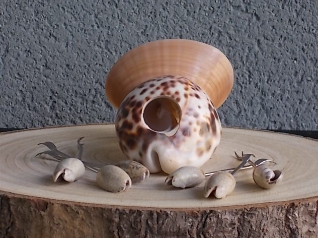 Porte Piques en Coquillages. Corps Cypraera Tigris, dit Escargot porcelaine, Ecru moucheté Marron. Socle Callista Chione dit Vernis, Beige aspect brillant. Ensemble de 6 Piques, Oliva, enroulé en spires, Beige moucheté au Brun marbré. Tige en métal inoxydable double fourche.