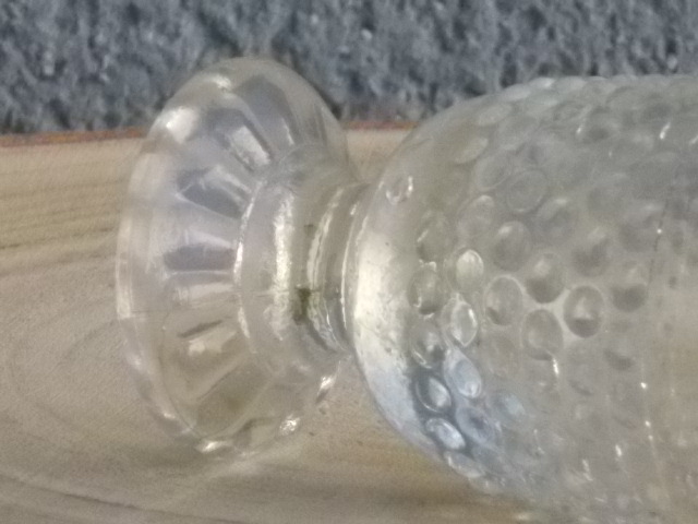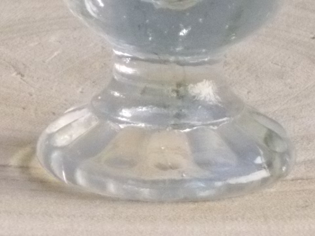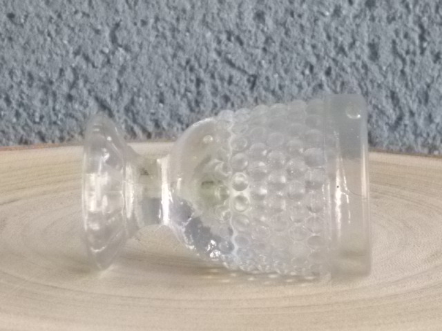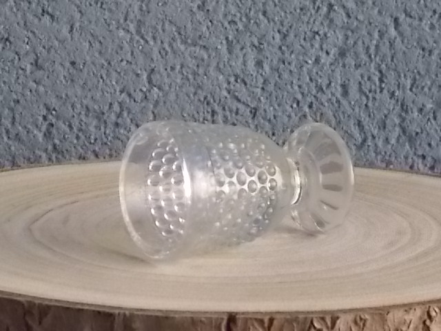 Coquetier piédouche, en verre épais translucide soufflé moulé. Décors Perles de verre, rebord lisse en bordure, cotes plates sur dessus pied. Edité début XX éme siècle.