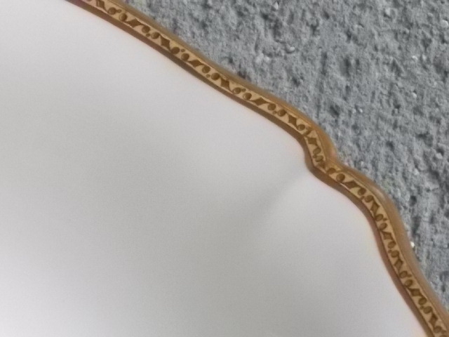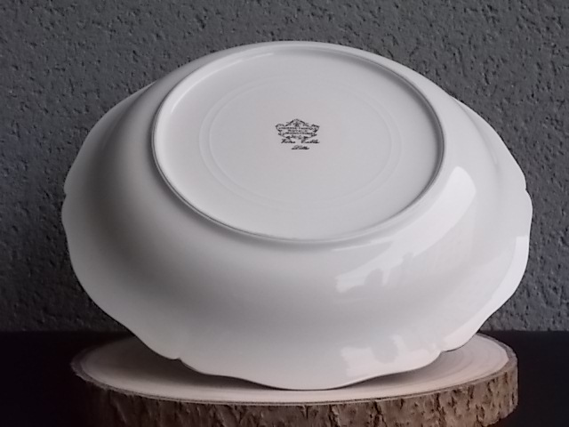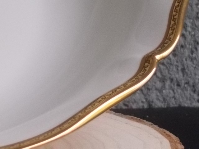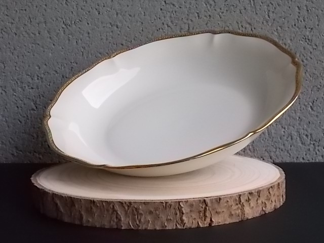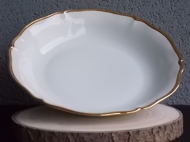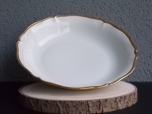 Légumier "Or", en porcelaine Blanche. Forme bassine, à bordure chantournée. Décors de frise à motif géométrique de point et losange, filet et aplat en dorure polie à l'Agate. Distribué par "Votre table" Lille. De L'Ancienne Fabrique Royale, Limoges France.