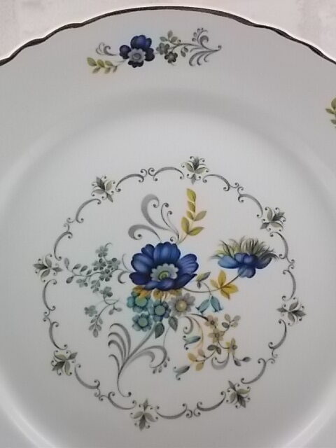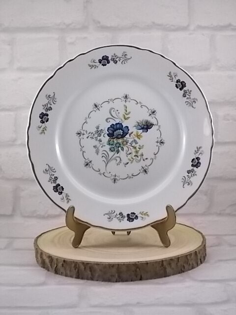 Plat de service rond creux "Chaillot", en faïence Blanche, à bordure festonnée. Décors floral sérigraphié, motif de fleurs stylisées en camaïeu de Bleu, Vert, Ocre et Gris. Edité dans les années 70. De la manufacture de faïence Moulin des Loups Orchies, Nord, France.