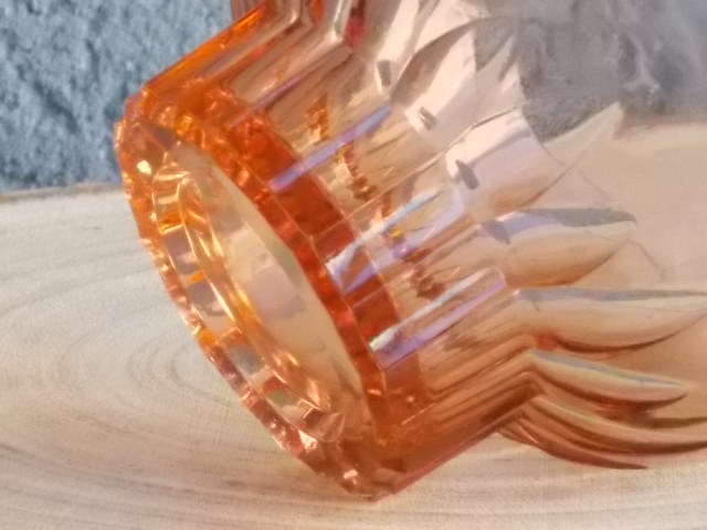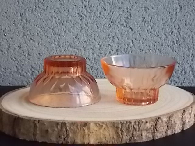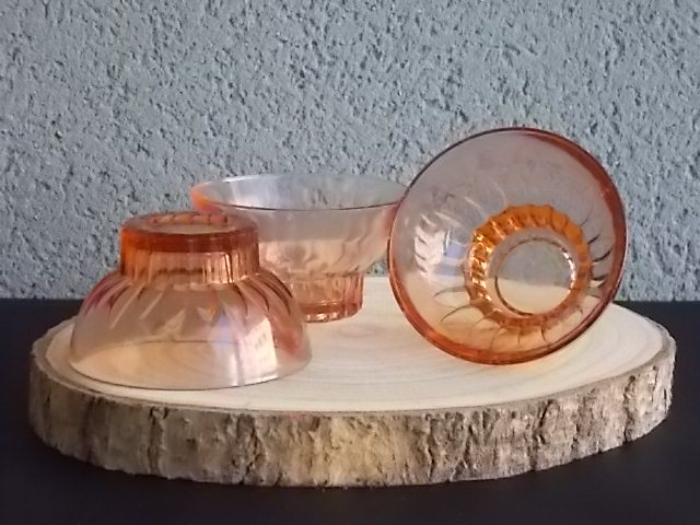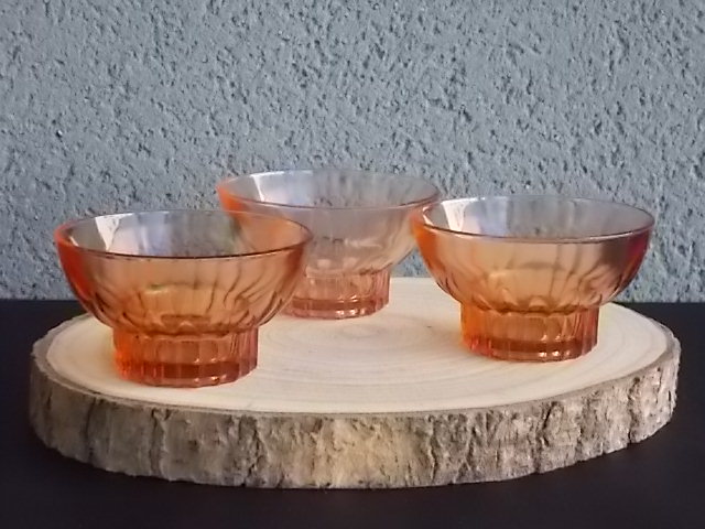 Coupe à Champagne, en verre teinté Saumon, moulé pressé. Décors de plissé au Paraison. Base socle creux facettes incurvées. Lettre bâton en relief. Edité dans première moitié du XX ème siècle. Pour la Marque Sapoluxe. (Lessive - Détergent - Savon) De la Fabrique Magnin et Mannés 1930/76. Vellexore Haute-Saône. Proposé en lot de 3 coupes.