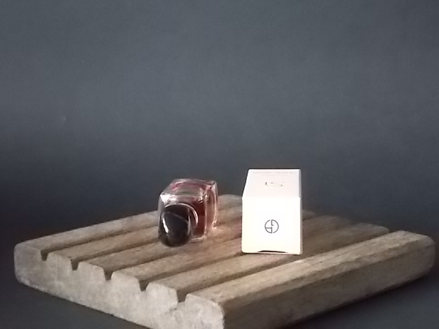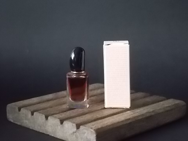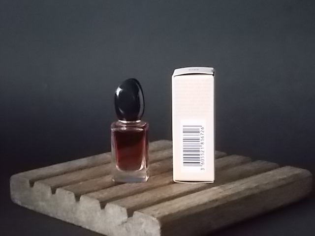 Si, flacon en verre translucide. Forme rectangulaire à base carré. Bouchon à clips, forme Galet à base anneau Doré, en plastique Noir. Sérigraphie Grise, 2 lignes. Eau de Parfum 7 ml. Parfum créé en 2013. De la maison Giorgio Armani Paris.