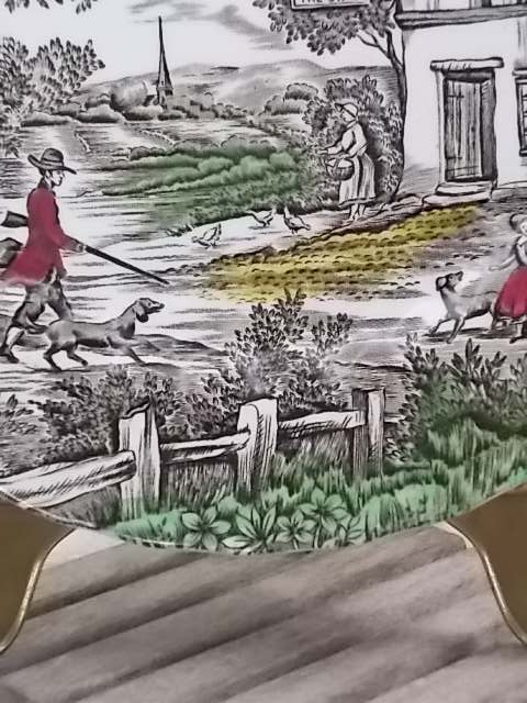 Assiette "The Hunter", En faïence à décors de scène de chasse, peint à la main, aux couleurs permanentes. Ainsi qu'un léger feston en bordure d'assiette, et le bord torsadé. De Myott, fabrication à Staffordshire, England, année 1960.