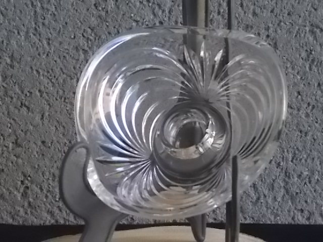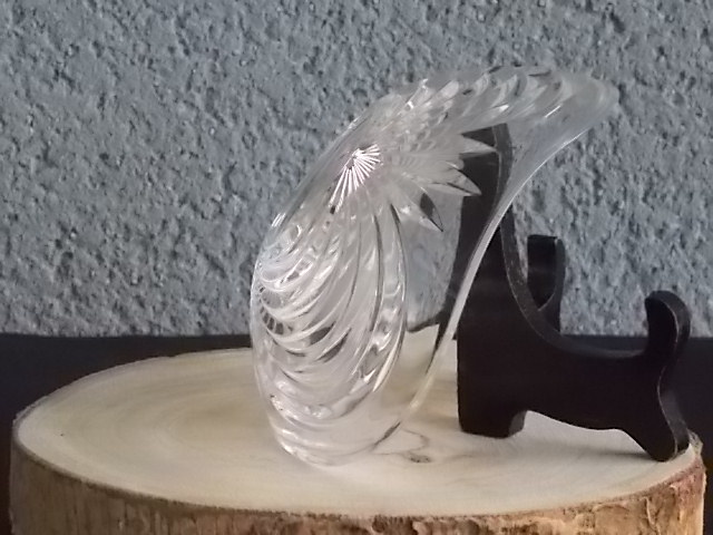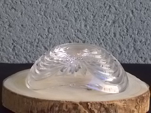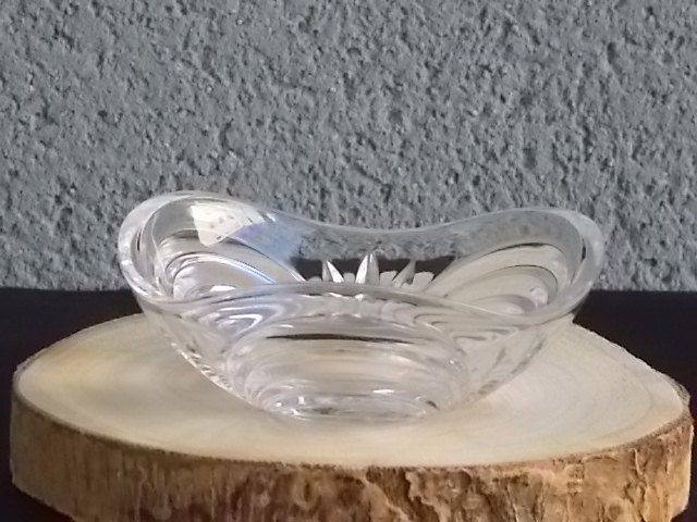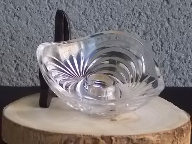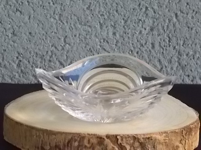 Bougeoir en Cristal translucide moulé, 24 % de Plomb. Forme coupelle triangulaire à angles arrondis, à cotés incurvés. Butées en relief de maintient pour bougie chandelier 2 cm. Décors d' Arcs rejoint par Palmes. Modèle Aurea. Edité de 1989 à 2009. De la maison Royal Crystal Rock, depuis 1967. Made in Italie.