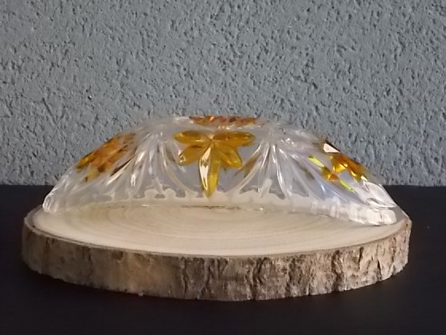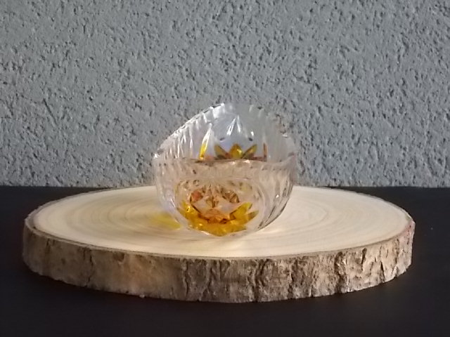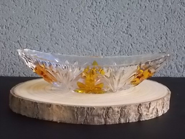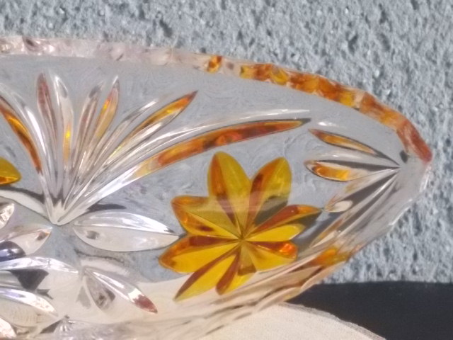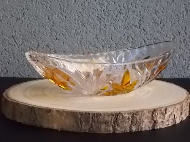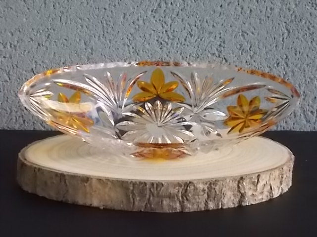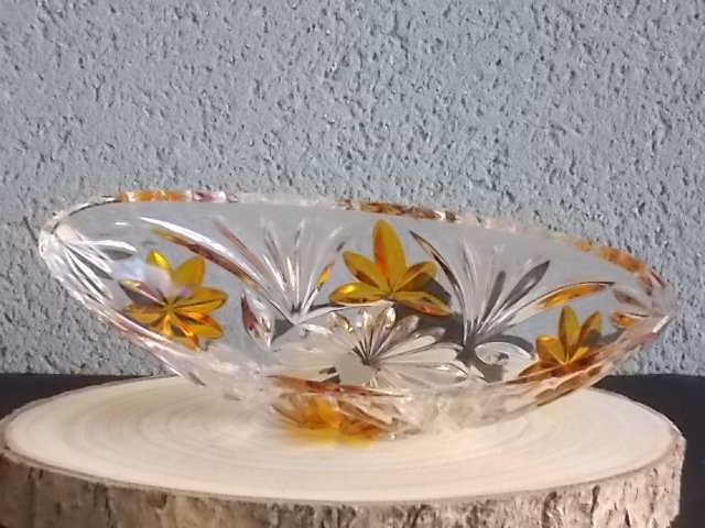 Coupe en Cristal moulé pressé, garanti 24 % de Plomb, translucide et Ambre. Forme "Elliptique", à décors de Palmes et décors colorés en alternance de Fleurs stylisées aux extrémités et Feuille sur les cotés. Bordure en cotes plates, et fond rosace Etoilé. Edité dans les années 70/80. Echt Bleikristall Gepresst. Made in West Germany.
